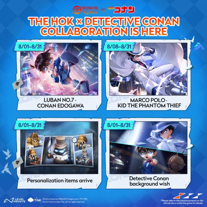 - Honor of Kings x Detective Conan collab is live until August 31, bringing themed map elements, mystery missions, and two iconic characters: Conan Edogawa and Kid the Phantom Thief.
