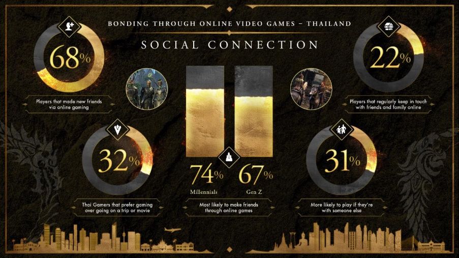 The study reveals that 68% of Thai gamers have made new friends through online games, such as Elder Scrolls Online, with Millennials (74%) and Gen Z (67%) leading the way. Urban players were more likely to form new connections (72%) than rural gamers (56%), though the desire to connect through games remains strong across the country.