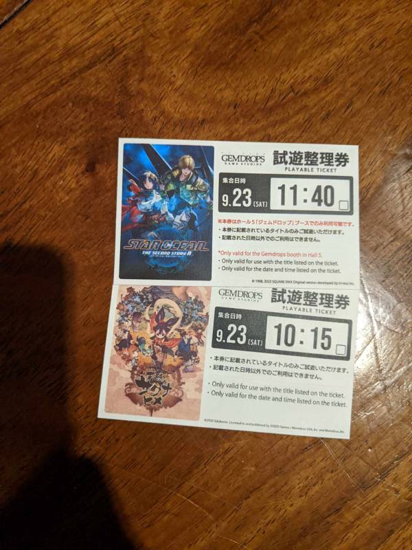 One thing we didn’t know beforehand is that you can request time slots for demo games. Booth staff will give you a stub with your scheduled time, and for example, we were given a 10:00 AM stub to play YS X at 11:50 AM. These lines move faster than general queues.