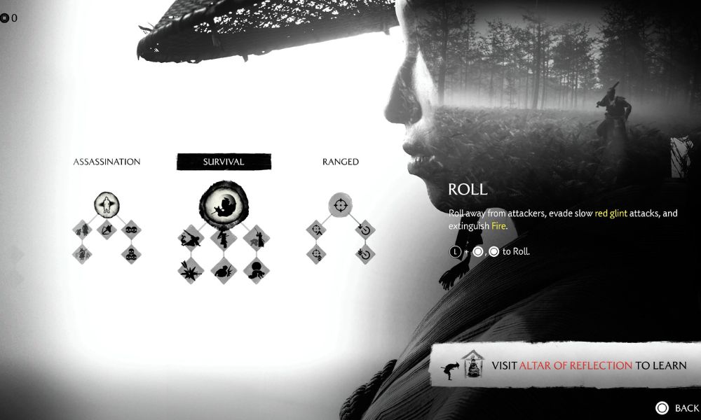 After your duel with Crow Genzo, deal with a few more ronin, and you’re not only rewarded with another Altar of Reflection but also the Metsubushi quickfire weapon that blinds enemies. For your next Skill, under the Onryō path, learn the Roll to help you cover some distance in a tight situation. At this point, you should be skilled and mobile enough during fights, so next let’s build up your stealth skills.