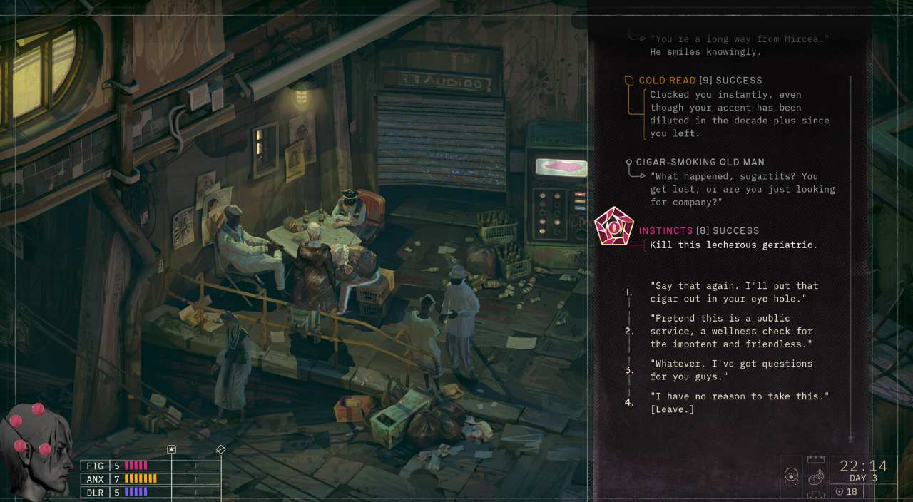 In ZERO PARADES, players step into the shoes of Herschel Wilk (codename CASCADE), a brilliant but burnt-out operative returning from “spy-purgatory” for one final mission. The game explores themes of failure, redemption, and the fragility of the human condition, with dialogue checks that turn setbacks into unique narrative branches.